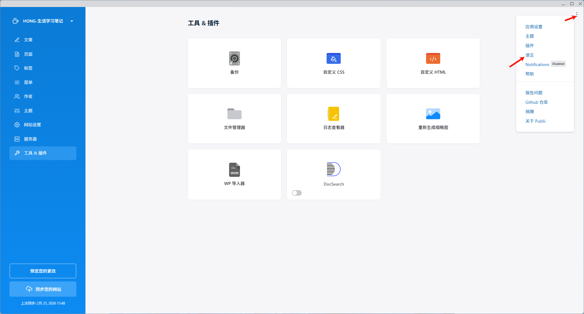 Publii默认是英文,中文包需要自己下载安装,点击右上角三个点就能看到语言language