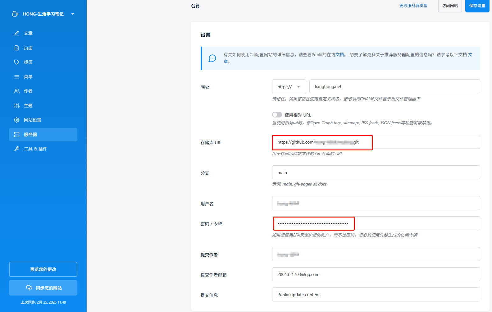 服务器类型选择Git网址就填你自己的域名,存储库url填上面在github获取到的git地址,分支填为main,用户名为github的用户名,密码令牌就是在github生成的token令牌,提交作者和邮箱随便填,填完后保存即可