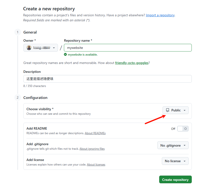 登录github账号进入主页创建一个仓库,名字随便填,可见性设置为Public,然后点击创建按钮即可