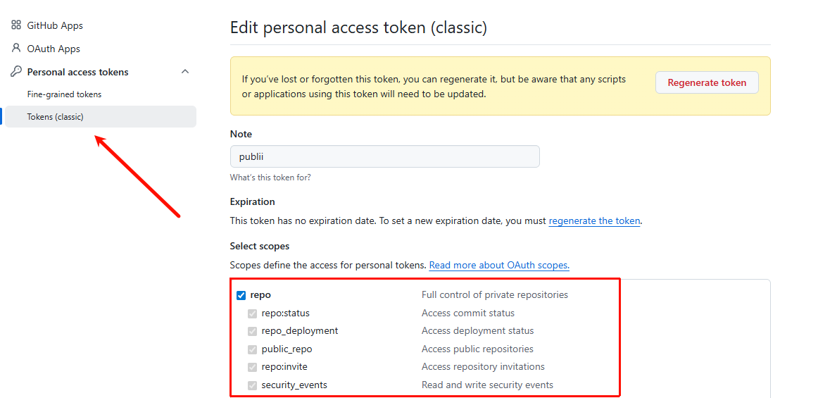 获取GitHub的访问令牌是关键,在GitHub的账号设置中,依次进入Settings→Developer settings→Personal access tokens→Tokens (classic)以获取令牌。在生成新令牌时,需要为Note字段输入一个名称,设置无有效期限制,并勾选仓库的全部权限,如下图(我这是已经创建过的所以页面不一样)