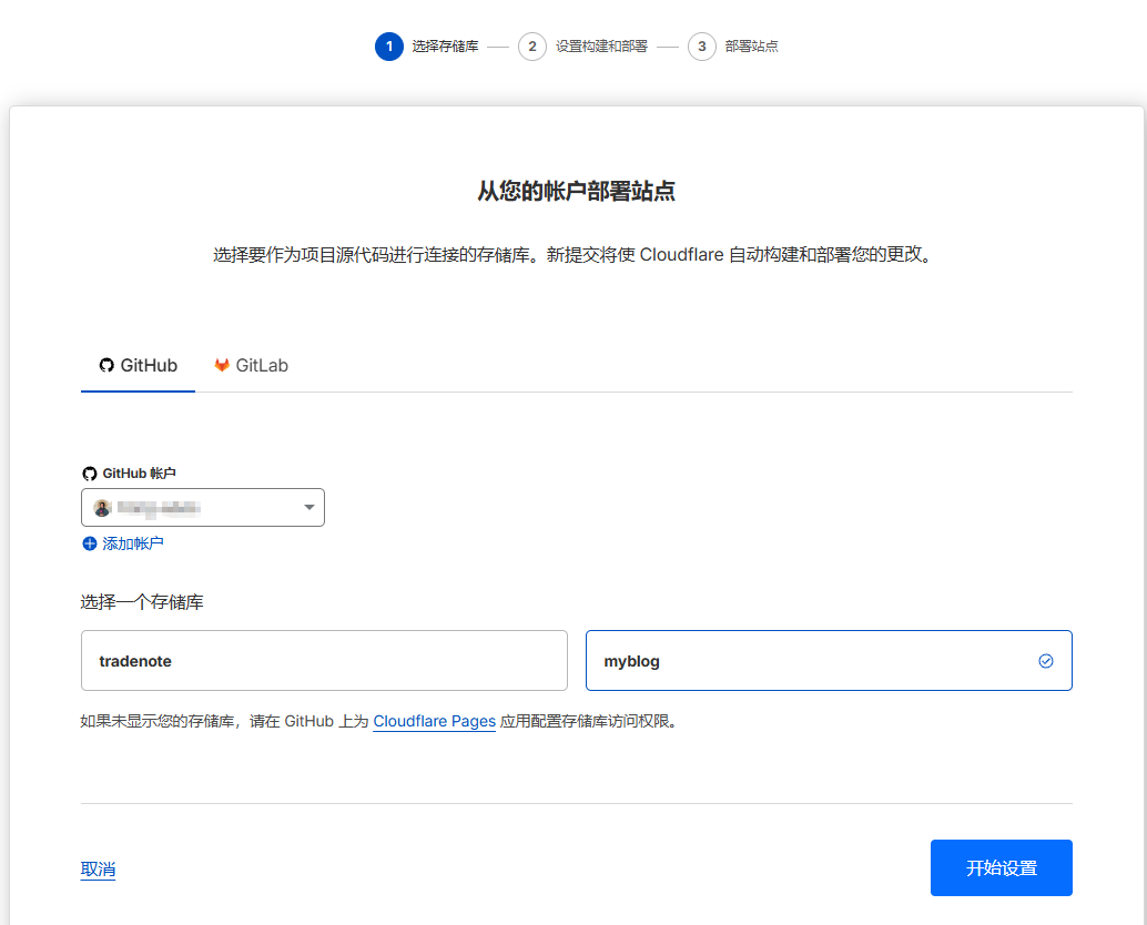 授权之后点击下方想要部署Pages?这里的开始使用按钮,然后点击导入现有的git存储库,然后选择你的仓库然后直接点击开始设置,然后直接点击保存部署就会自动部署了
