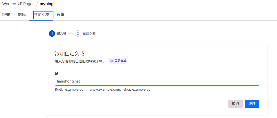 部署完之后cf会自动分配一个域名,如果我们想要绑定自己的域名就可以在自定义域名这里配置自己的域名