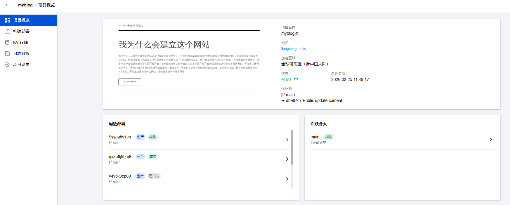 这是腾讯的也网页托管业务,同样是免费的,适合托管域名已经备案的网站,备案的域名可以用国内的节点,这样国内国外的访问速度都非常快,步骤跟cloudflarepages的步骤是一样的,edgeone更简单,也是点击连接github仓库,然后选择仓库点击部署就好了,部署好如下图