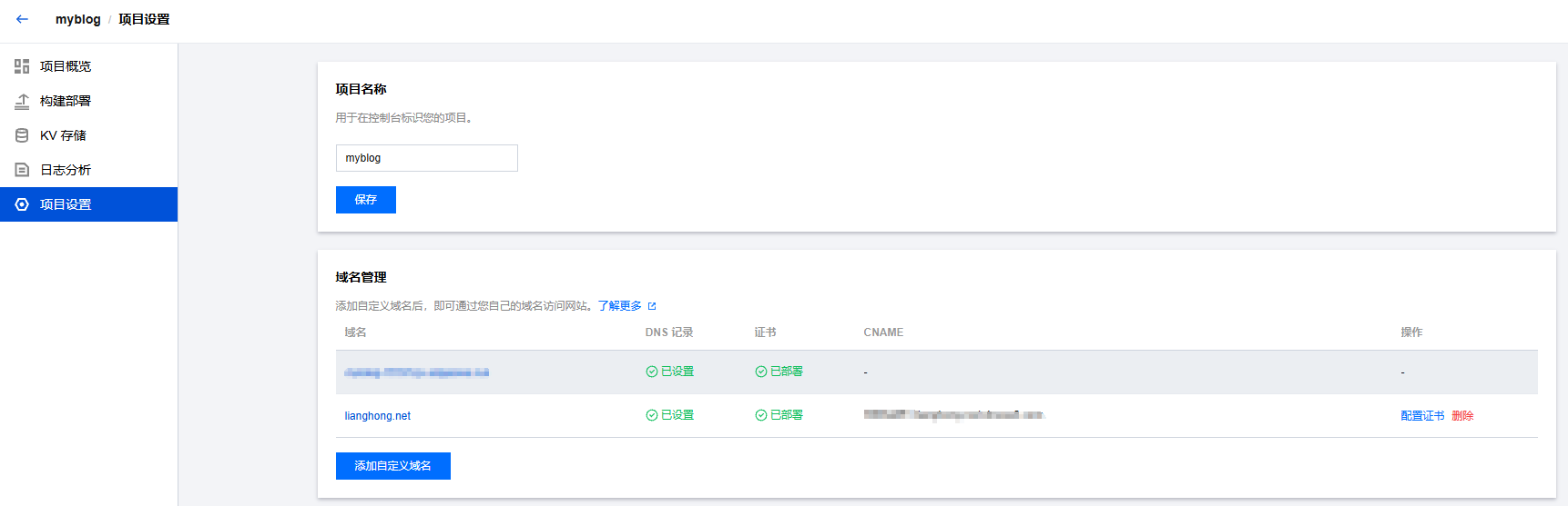 点击项目设置,然后右边点击添加自定义域名填入自己的域名即可