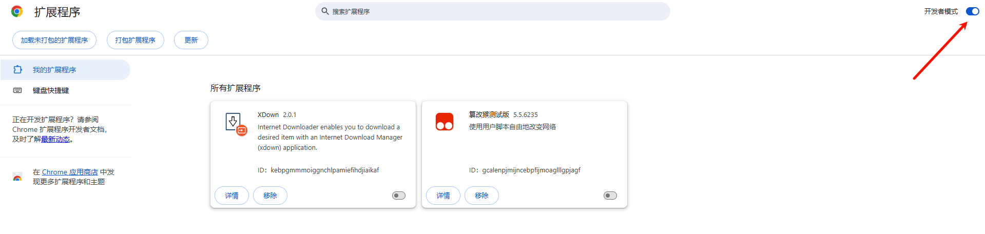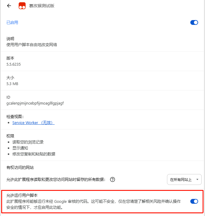 开启油猴后点击拓展下的详情按钮,把允许运行用户脚本勾选上,否则油猴脚本不会生效,这一步其它浏览器在商店直接安装油猴的也需要检查是否开启