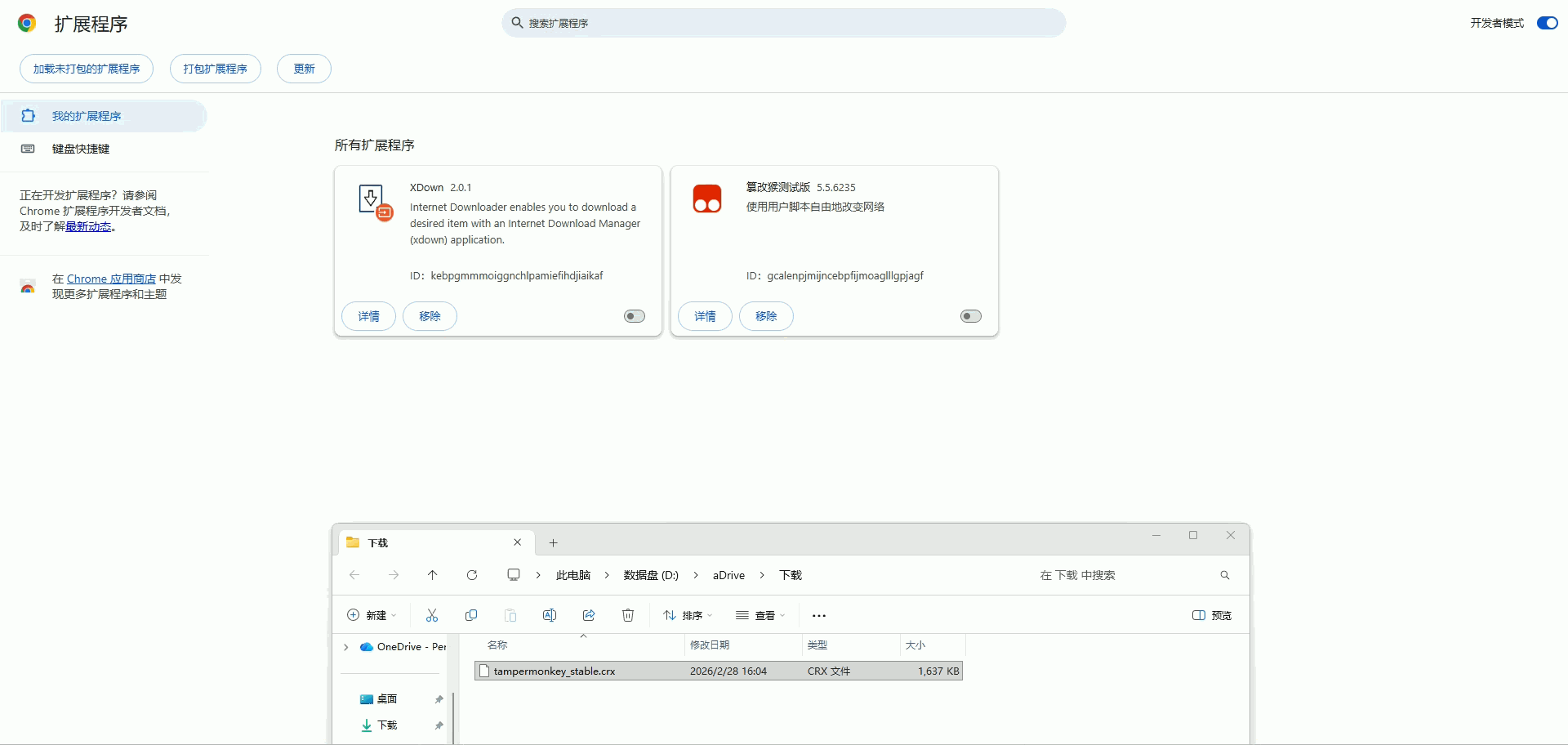 Chorme浏览器点击右上角拓展程序进入该页面,或者直接导航栏输入chrome://extensions/,然后把右上角的开发者模式勾选好(请忽略掉我已经安装好的测试版拓展)